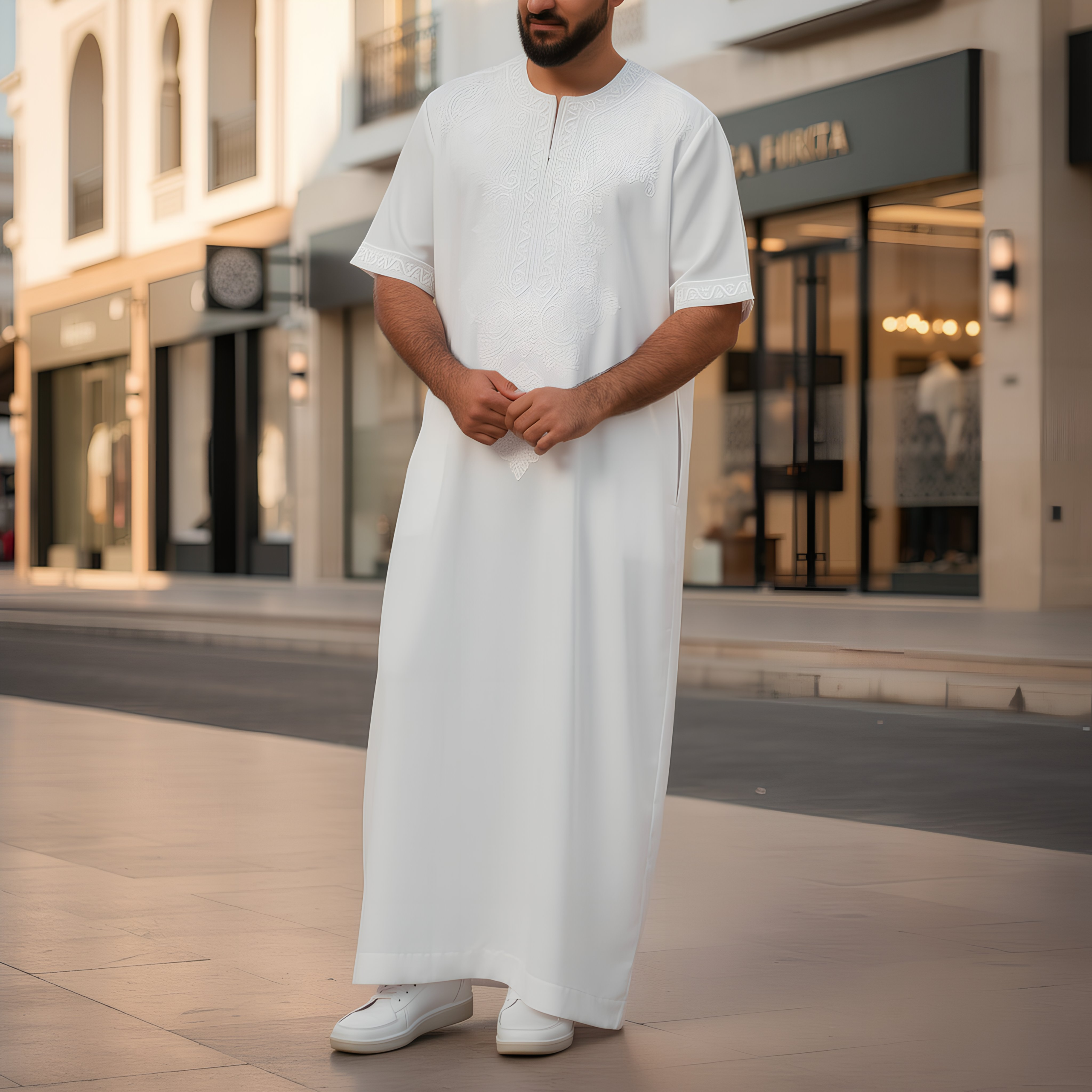 The Golden Heritage Jellaba is a celebration of the ‘Fassi’ style of embroidery. Using traditional patterns and authentic gold-colored silk threads, this garment is a standout piece in any luxury wardrobe, designed to be passed down through generations.